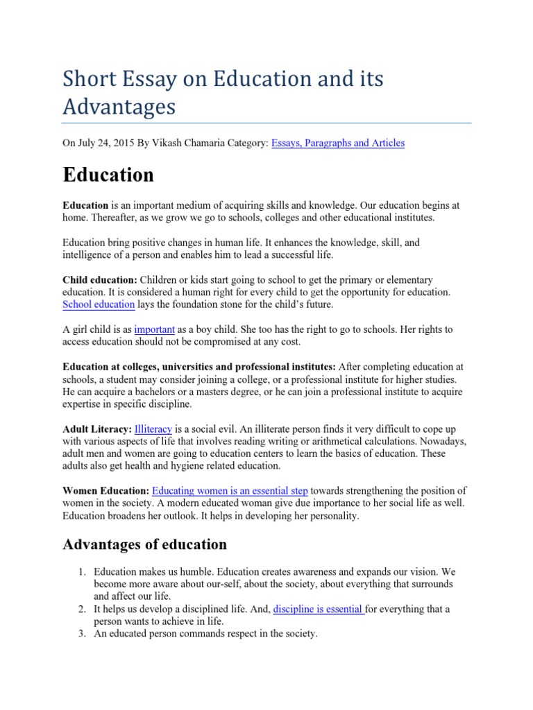 These example essays are to help you understanding how to write an essay on education essay topics. Modern education is an interdisciplinary field, including disciplines (to name just a few) such as history and sociology, as well as topical areas such as globalization and technology. Education essay examples below include essays on many disciplinary areas such as · Essay Example on Importance of Education Thesis Statement of Importance of Education Essay. Education is essential for everyone. It has a positive effect on peoples’ lives. Some people may say college is not worth it. But it opens many doors and creates opportunities. Introduction of Importance of Education Essay + Words Essay on Education. Education is an important tool which is very useful in everybody’s life. Education is what differentiates us from other living beings on earth. It makes man the smartest creature on earth. It empowers humans and gets them ready to face challenges of life efficiently. With that being said, education still remains Estimated Reading Time: 4 mins